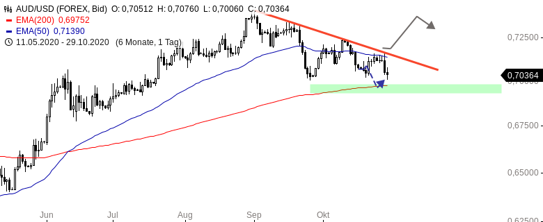 Dort mussten sich die Käufer dann allerdings geschlagen geben - gestern kam das Paar unter massiven Verkaufsdruck. Das nächste Kursziel im Bereich des EMA200 bei 0,6975 USD sollte mit dem aktuellen Abwärtsmomentum auch noch in den kommenden Tagen erreicht werden.