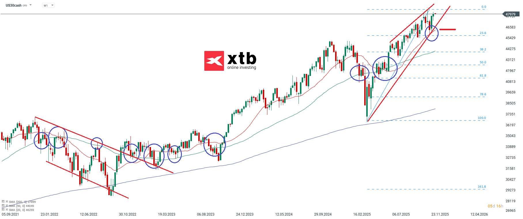 Der Dow Jones startete am Montag bei 47.485 Punkten und lag damit 1.103 Punkte über der vorbörslichen Notierung der Vorwoche, jedoch 237 Punkte unter dem damaligen Wochenschluss. Zu Wochenbeginn verlief der Handel übergeordnet seitwärts. Das Tageshoch am Montag wurde abverkauft, das Tagestief hingegen sofort zurückgekauft.