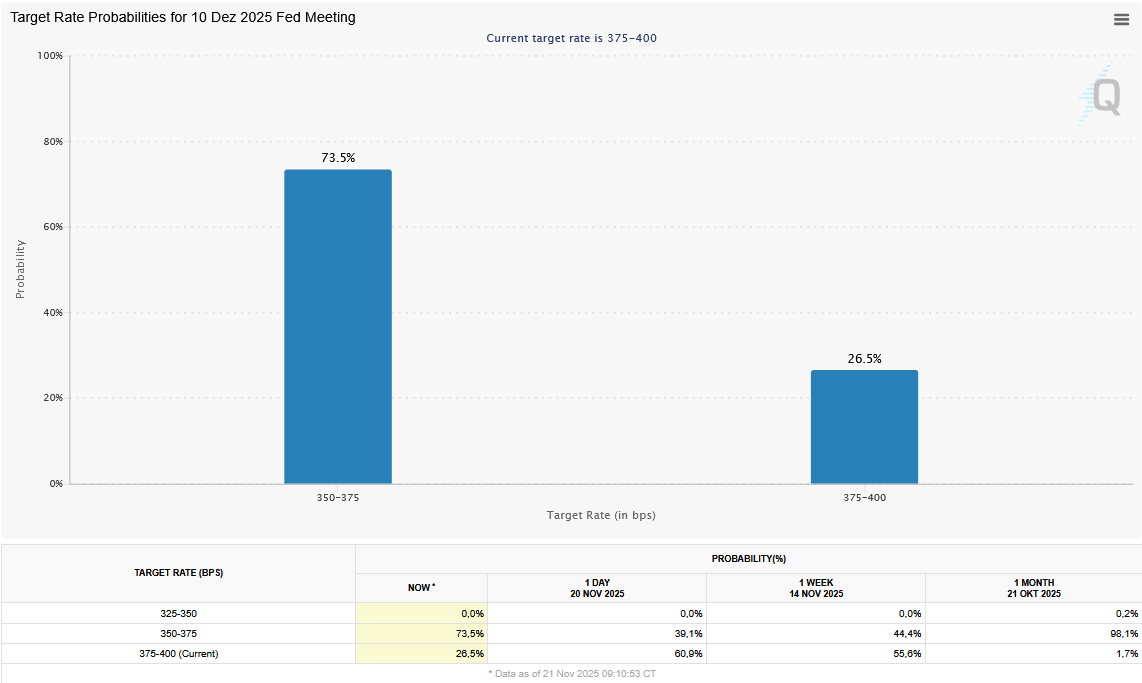 Im Protokoll hieß es nämlich ganz klar: "Viele Teilnehmer sprachen sich dafür aus, die Zielspanne […] für den Rest des Jahres unverändert zu lassen." Das kann nichts anderes bedeuten, als dass eine Zinssenkung im Dezember vom Tisch ist. Prompt fiel die Wahrscheinlichkeit für eine Zinssenkung am Mittwoch auf nur noch 30 % (siehe rote Markierung).