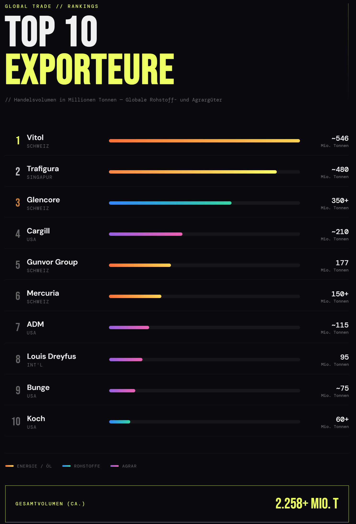 Ranking der Top 10 Global Exporters von Rohstoffen und Agrargütern, gemessen am jährlichen Handelsvolumen in Millionen Tonnen. Die größten Commodity Trader, die das Rückgrat der globalen Lieferketten für Energie, Metalle und Agrarprodukte bilden. Vitol, Trafigura und Glencore kontrollieren diesen Bereich. Diese Firmen agieren oft im Hintergrund, bewegen aber physische Warenmengen, die dem Energieverbrauch ganzer Industrienationen entsprechen. Man beachte die geografische Konzentration: Die Schweiz mit 3 Firmen und die USA 4 Firmen sind die dominanten Standorte für diese Drehkreuze.