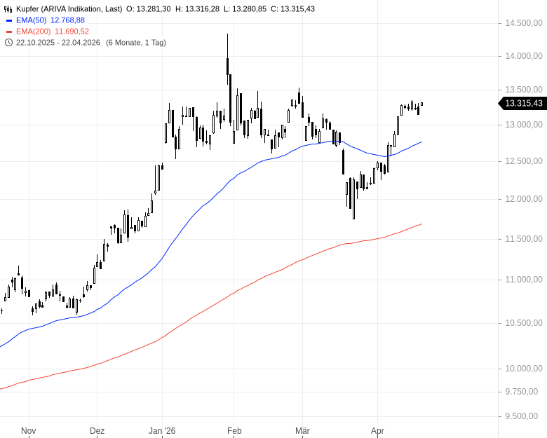 - Kupfer - WKN: 720321 - ISIN: XC0007203216 - Kurs: 13.307,36 $/t (ARIVA Indikation)