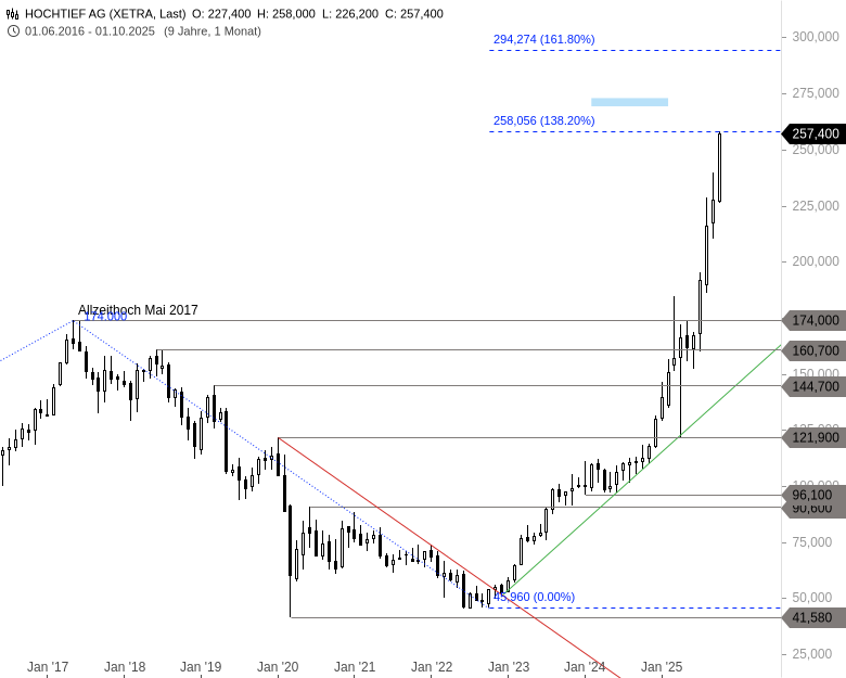 Die Infrastruktur-Rally ist weiter einer der großen Treiber bei den deutschen Nebenwerten. Als erste der großen Vier erreichten die Anteile von Vossloh im Juli das Kursziel bei 93 EUR und tendieren seitdem seitwärts. Die Aktie von Hochtief schaffte in der letzten Woche ihren gewaltigen Ausbruch und touchiert jetzt das Projektionsziel bei 258 EUR, an dem der Höhenflug vorübergehend enden kann. Über der Marke wäre ein weiteres Ziel im Bereich von 270 und später 294 EUR anzusiedeln.