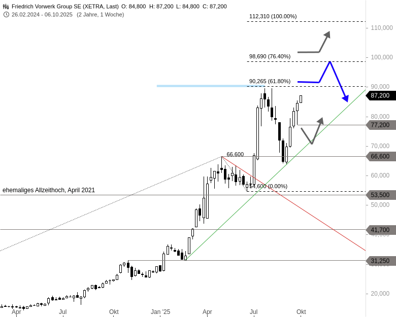 Die Aktie von Friedrich Vorwerk hatte das zentrale Kursziel bei 90,26 EUR im Rahmen des fulminanten Anstiegs der letzten Monate fast erreicht, ehe im August ein massiver Abverkauf einsetzte. Dieser hat das Aufwärtspotenzial zunächst reduziert.