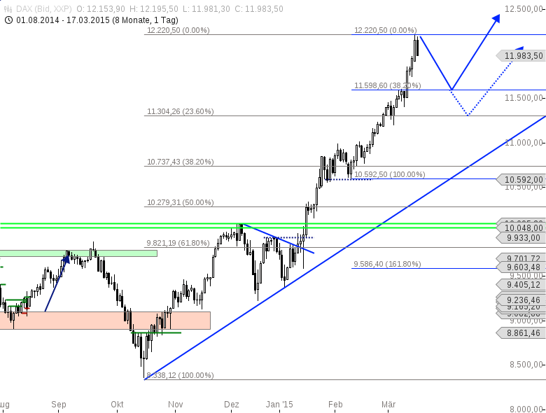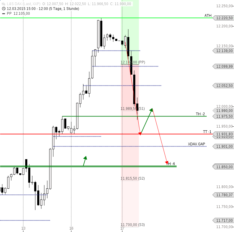 Im weiteren Verlauf muss man immer sehen, wie sich der DAX an den Preisbereichen verhält. Es kann sein, dass am Tief des gestrigen Tages noch weitere Verkaufsorders liegen und den DAX dann sogar in Richtung 11850 befördern. Aber so weit will ich jetzt noch nicht gehen.