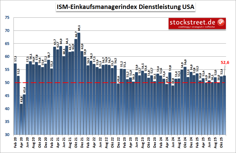 Die nächsten offiziellen Arbeitsmarktdaten aus den USA wird es erst Mitte Dezember geben. Daher sind andere Indikatoren derzeit umso bedeutsamer, um die Lage von Wirtschaft und Arbeitsmarkt einzuschätzen. Die wichtigsten sind dabei sicherlich die Einkaufsmanagerindizes (PMIs).