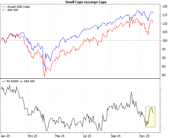 Wenn der zunehmende Lageraufbau bzw. die schwachen Neuaufträge Hinweise auf eine bevorstehende Schwäche der US-Wirtschaft oder auch nur der kleineren und mittleren Unternehmen sein sollten, dann lassen die Börsianer sie vorerst noch unbeachtet: Der Russell 2000, der Index der US-Small Caps zeigt seit neuestem wieder Stärke gegen den Gesamtmarkt bzw. die Large Caps: