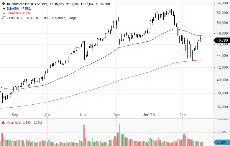 Im vergangenen Jahr hatte ich bereits die Aktie von Toll Brothers vorgestellt. Dieser Wert bleibt mein Favorit. Toll Brothers ist auf ein höheres Segment spezialisiert. Die Margen sind hoch und die Steuerreform, die das hochpreisige Segment steuerlich weniger begünstigt, greift in dem Segment, welches Toll Brothers bedient, nur am Rande. Es ist eine Art Sweet Spot. Die Korrektur an den Märkten hat in dieser Branche eine Kaufgelegenheit geschaffen.