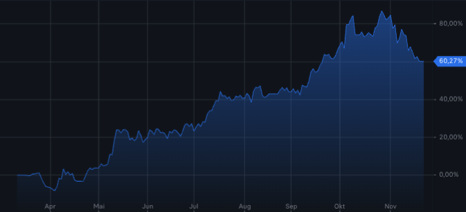 Ja schon eine exzellente Performance. Leider kann man das als Otto NormalverTRADER , der nicht den ganzen Tag vor dem Börsen -Bildschirm abhängen kann (oder will), nicht nachbilden. Würde es einen entsprechenden Schein/Zertifikat dazu geben, wäre ich schon längst eingestiegen. Und hätte beim Einsatz noch ne "null" hinten drangehängt 😎