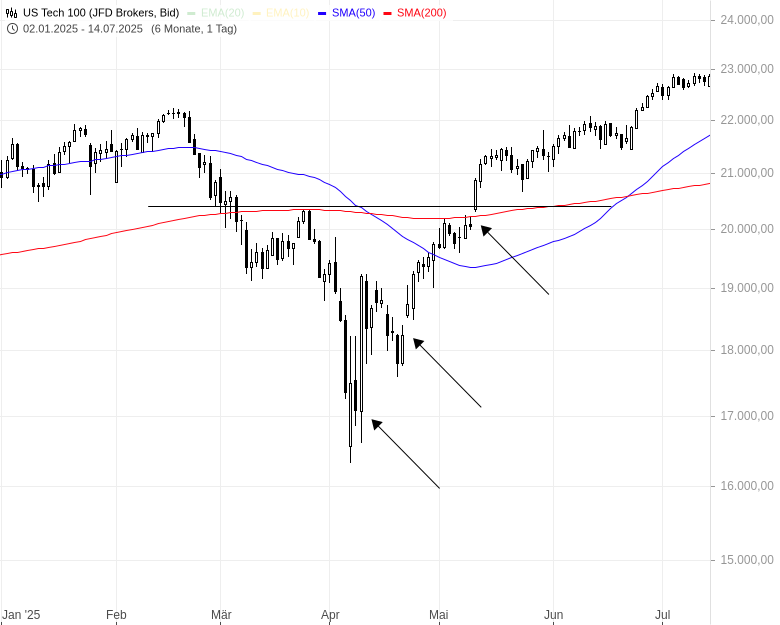 Diesem Muster kann man nicht nur in den Indizes, sondern auch bei Aktien folgen. Die stärksten Titel der nächsten Rally sind allerdings zum Zeitpunkt des Higher Lows bereits auf neue Allzeithochs ausgebrochen und haben dadurch bereits relative Stärke signalisiert. Hier suche ich ab sofort Einstiege bei Rückläufen zu den gleitenden Durchschnitten.