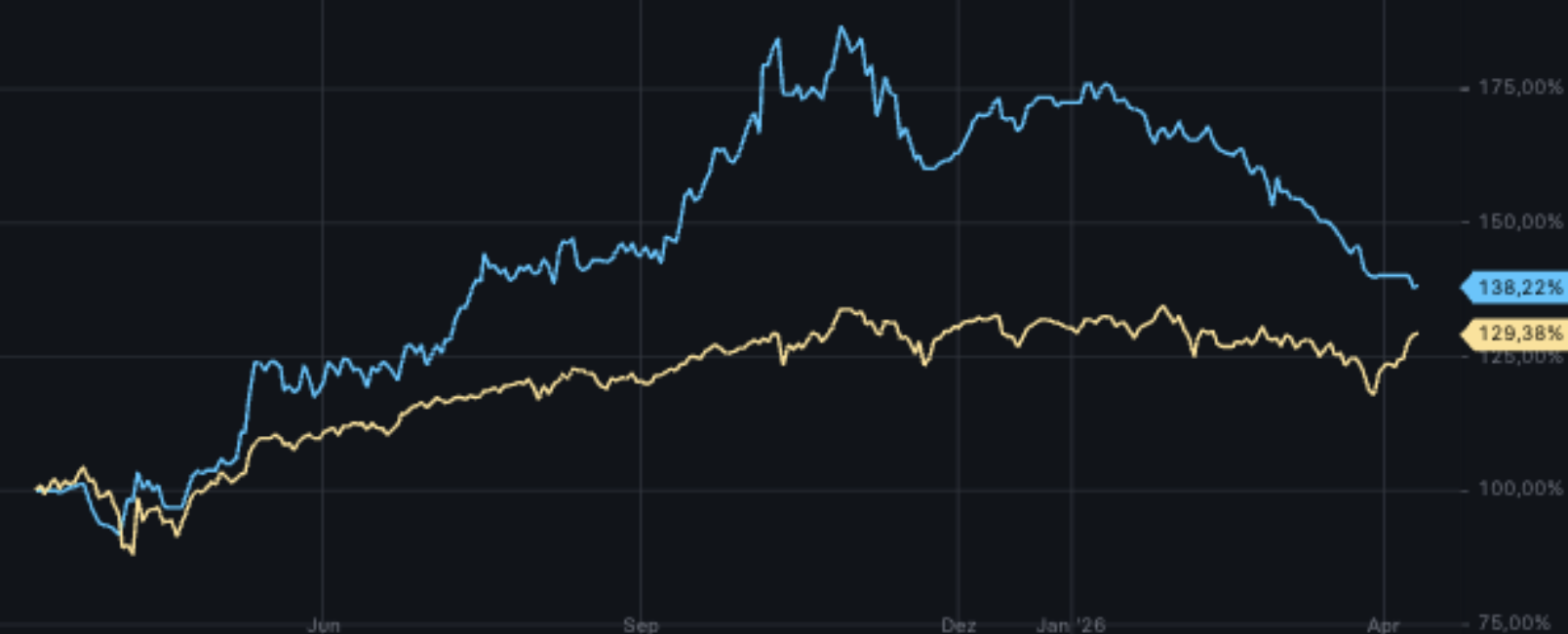 Das Ten Thousand Trader-Depot stagniert nach wie vor. Seit über zwei Wochen konsolidiere ich leicht. Der Nasdaq hat sich seit der Ankündigung einer Verhandlungsbereitschaft im Iran-Krieg von Seiten der USA schnell erholt, wie man im Nasdaq-Depot-Performance-Vergleich unten sieht. Da ich nach wie vor nicht versuche das Tief zu erwischen oder blind und breit investiert bin, war ich vor dem Wochenende der Nachricht nur gering investiert. Nach einem sprunghaften Up-Gap macht es keinen Sinn im kleinen Depot sofort größere Positionen zu eröffnen. Das Risiko ist zu hoch mit scharfen Gegenbewegungen zu große Verluste zu machen. Kapitalerhalt für den größeren Pitch steht nach wie vor an oberster Stelle.