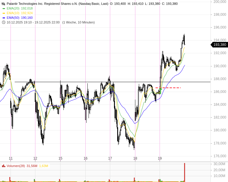 - Palantir Technologies Inc. Registered Shares o.N.Kursstand: 193,750 $ (Nasdaq) - Zum Zeitpunkt der VeröffentlichungVerkaufenKaufen