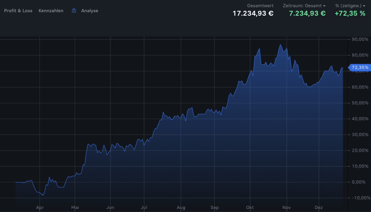 In der vergangenen Woche konnte sich das Ten Thousand Trader-Depot weiter vom November-Einbruch erholen. Aber einfach ist das nicht. Derzeit schraube ich an der Performance mit einem minimalen Investitionsgrad von nur 20 %. So bleibe ich flexibel im instabilen Markt. Da viele Handelnde schon in den Ferien sind, bewegt geringes Volumen die Kurse, was zusätzlich zu erhöhter Volatilität führt. Dementsprechend versuche ich mich mit gezielten Trades und engem Stop stabil nach oben zu arbeiten. Präzise Einstiege mit engen Absicherungen helfen dabei.