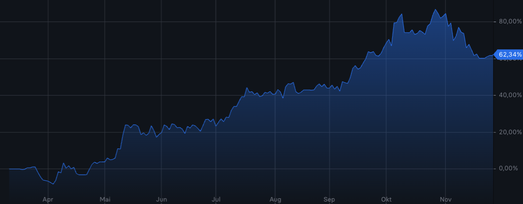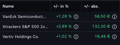Ich hatte zunächst einen 2-fach gehebelten S&P-500-ETF ins Depot gekauft. Als dieser Trade im Gewinn war, habe ich einen Semiconductor-ETF dazu genommen. Damit versuche ich zunächst, eine breite Investitionsbasis aufzubauen. Als Vertiv am Freitag ausgebrochen ist, habe ich die erste Tranche einer Einzelaktie gekauft. Wichtig ist mir dabei, dass die meisten Positionen im Depot bereits Gewinne verzeichnen. Ziehen die ersten Werte an, kann es sein, dass ich bei den kommenden Käufen auf Derivate mit kleinem Hebel setze. Damit schiebe ich das Depot sozusagen künstlich in den Margin-Bereich, also in einen Investitionsgrad von 120 % bis 150 %. Neue Käufe erfolgen erst, wenn die vorherige Position meine Strategie bestätigt.