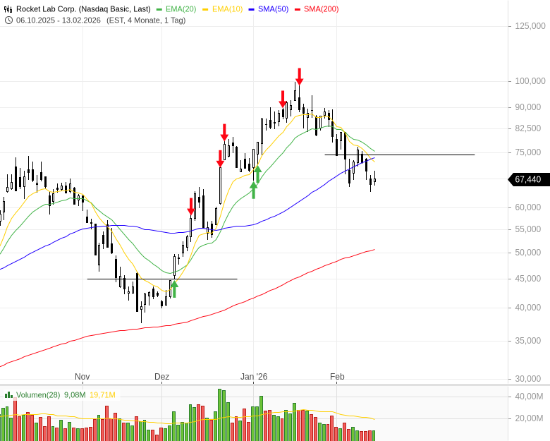 Mit Rocket Lab hatten wir im Depot von Ende 2025 bis Anfang 2026 viel Freude. Mit einem ersten Kauf vor dem EMA-Crossback konnte ich die Aktie sehr gut handeln, und auch weitere Rücksetzer boten gute Chancen. Selbst der endgültige Ausstieg erfolgte zum richtigen Zeitpunkt, was aber eher eine Seltenheit ist, mit der man nicht rechnen sollte. Wenn Rocket Lab sich in den kommenden Tagen unter den gleitenden Durchschnitten stabilisieren kann, dann rückt der Chart wieder weiter nach oben auf die Watchlist. Ab 75 USD ist dann ein Durchbruch der 50-Tage-Linie und ein erneuter Einstieg möglich. Aber zunächst muss uns der Kurs zeigen, dass er bereit ist zu steigen, vorher geschieht nichts.