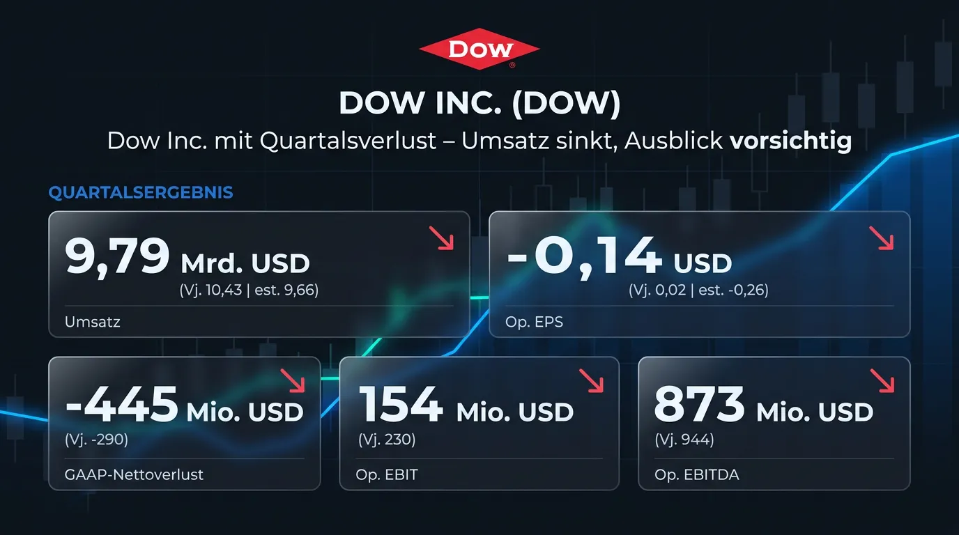 Der Chemiekonzern Dow Inc. hat im ersten Quartal 2026 einen GAAP-Nettoverlust von 445 Mio. USD verbucht, nach einem Verlust von 290 Mio. USD im Vorjahreszeitraum. Der Umsatz sank um 6 % auf 9,79 Mrd. USD und übertraf damit knapp die Analystenerwartungen von 9,66 Mrd. USD. Das operative EPS lag bei minus 0,14 USD – besser als die Konsensschätzung von minus 0,26 USD, aber deutlich unter dem Vorjahreswert von plus 0,02 USD. Belastet wurde das Ergebnis vor allem durch niedrigere Preise sowie Auswirkungen des Nahost-Konflikts auf das Segment Industrial Intermediates & Infrastructure, während das Segment Performance Materials & Coatings mit einem deutlich verbesserten operativen EBIT von 117 Mio. USD positiv herausstach. Für den weiteren Jahresverlauf setzt CEO Jim Fitterling auf das Kostensenkungsprogramm „Transform to Outperform