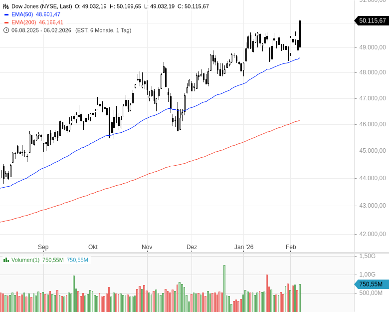 Eine breite Markterholung und eine Rotation in die Aktien realwirtschaftlicher Champions haben den Dow Jones Industrial Average am Freitag zum ersten Mal über die Marke von 50.000 Punkten steigen lassen. Im Wochenverlauf hatten Sorgen über mögliche KI-Verlierer den Gesamtmarkt noch belastet und vor allem im Softwaresektor zu drastischen Kursverlusten geführt.