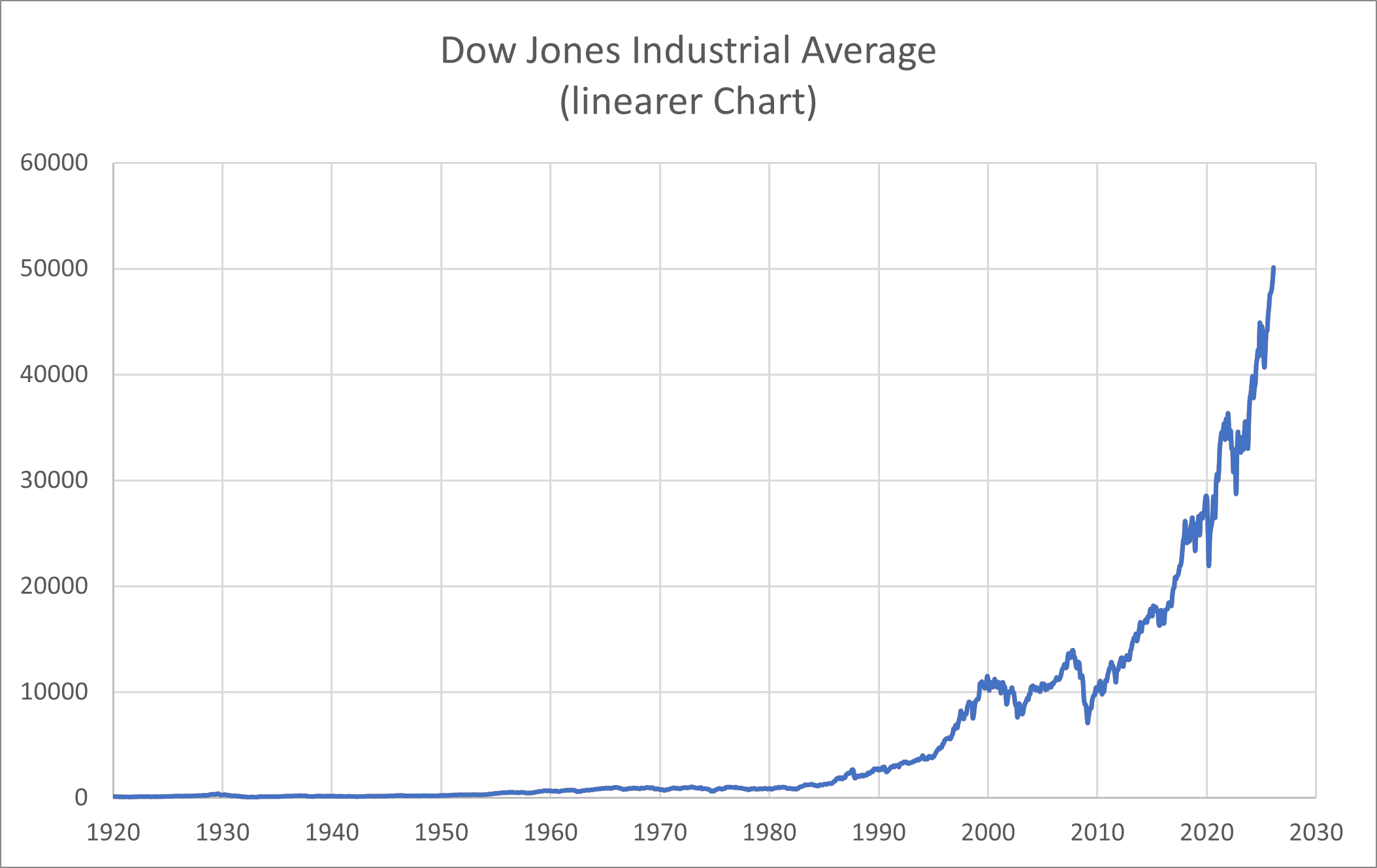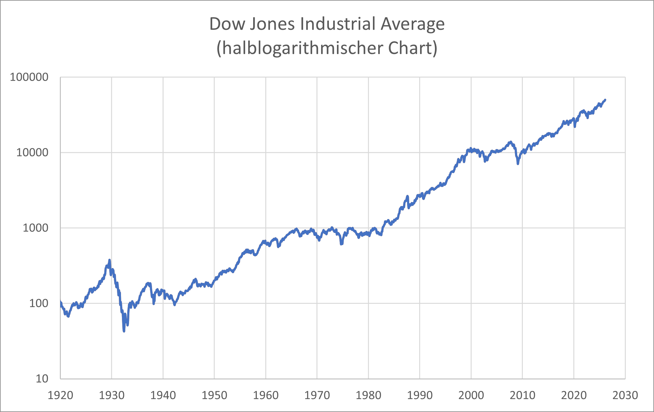 Die folgende Charts zeigen die Entwicklung des Dow Jones Index seit dem Jahr 1915 (Monatsschlusskurse), zunächst in einer linearen, dann in einer halblogarithmischen Darstellung.