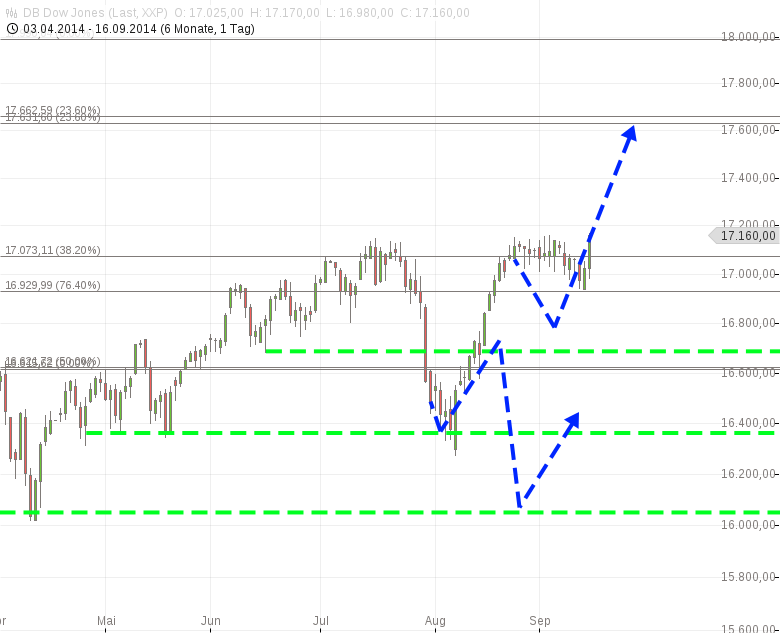 Seit Juli attackiert der Index den Bereich um 17.150 Punkte. Die Impulsivität des heutigen Anstiegs und die Tatsache, dass die Konsolidierung der letzten beiden Wochen auf hohem Niveau erfolgt ist, sprechen dafür, dass mit dem heutigen Tag die Ausbruchbewegung in Richtung 17.660 Punkte gestartet sein könnte. Kurzfristig eingegangene taktische Longpositionen können unterhalb von 16.929 Punkten mit Stoploss abgesichert werden.