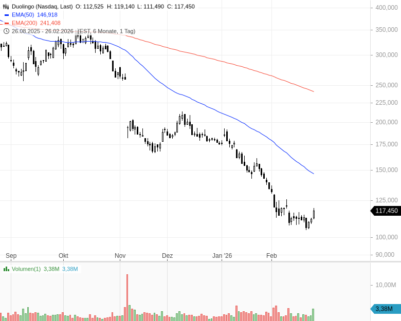 Im Zentrum der Debatte steht die Kennzahl "Bookings“, bei Duolingo ein besonders sensibler Frühindikator für die künftige Umsatzentwicklung. Für das erste Quartal erwartet das Unternehmen Bookings von rund 301,5 Mio. USD und bleibt damit klar unter dem Analystenkonsens von 329,7 Mio. USD. Für das Gesamtjahr stellt Duolingo Bookings zwischen 1,27 und 1,30 Mrd. USD in Aussicht, auch hier unter den Markterwartungen von 1,39 Mrd. USD. Beim Umsatz lautet die Spanne 1,20 bis 1,22 Mrd. USD und liegt ebenfalls unter den Schätzungen von 1,26 Mrd. USD. Der Kursrutsch zeigt, wie stark Investoren die bisherige Wachstumsstory vor allem an Tempo und Planbarkeit der Bookings ausgerichtet hatten.
