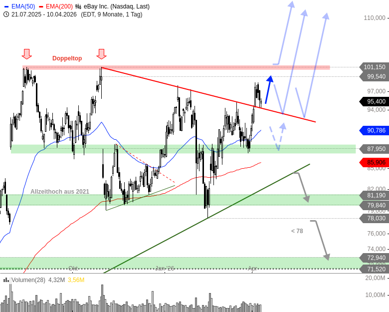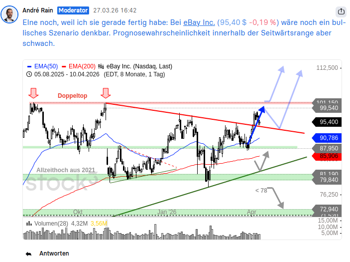 Im Zuge des Abverkaufs an den Aktienmärkten Ende März zeigte sich bei der eBay-Aktie relative Stärke. Sie rutschte nicht wie andere Werte auf neue Jahrestiefs ab, sondern hielt das erhöhte Kursniveau innerhalb der Seitwärtsrange. Am 27. März, als die US-Indizes auf Tauchstation gingen und neue Jahrestiefs markierten, wurde mit dieser relativen Stärke im Traders Talk bullisches Prognoseszenario vorgestellt, das bislang ganz gut aufgeht. Die Aktie drehte an der Kreuzunterstützung nach oben und kletterte auf neue Jahreshochs. Mit dem Traders Talk bist Du immer direkt am Puls der Märkte und hast die interessantesten Trading-Setups im Blick. Jetzt testen: