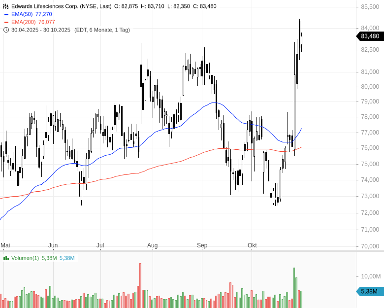 Währungseffekte trugen leicht zum Umsatzwachstum bei, belasteten jedoch die Margen. Für das Gesamtjahr stellt Edwards nun das obere Ende der bisherigen Prognose von 9 bis 10 % Umsatzwachstum in Aussicht. Die Gewinnschätzung wurde auf 2,56 bis 2,62 USD je Aktie angehoben. Im vierten Quartal erwartet das Unternehmen einen Umsatz zwischen 1,51 und 1,59 Mrd. USD sowie einen Gewinn je Aktie zwischen 0,58 und 0,64 USD. Das operative Ergebnis soll im mittleren 20-%-Bereich liegen, um die angestrebte Jahresmarge von 27 bis 28 % zu erreichen. Im Aortenklappengeschäft rechnet Edwards mit einem Jahreswachstum von 7 bis 8 %, mittelfristig peilt das Management rund 10 % Umsatzplus pro Jahr an.