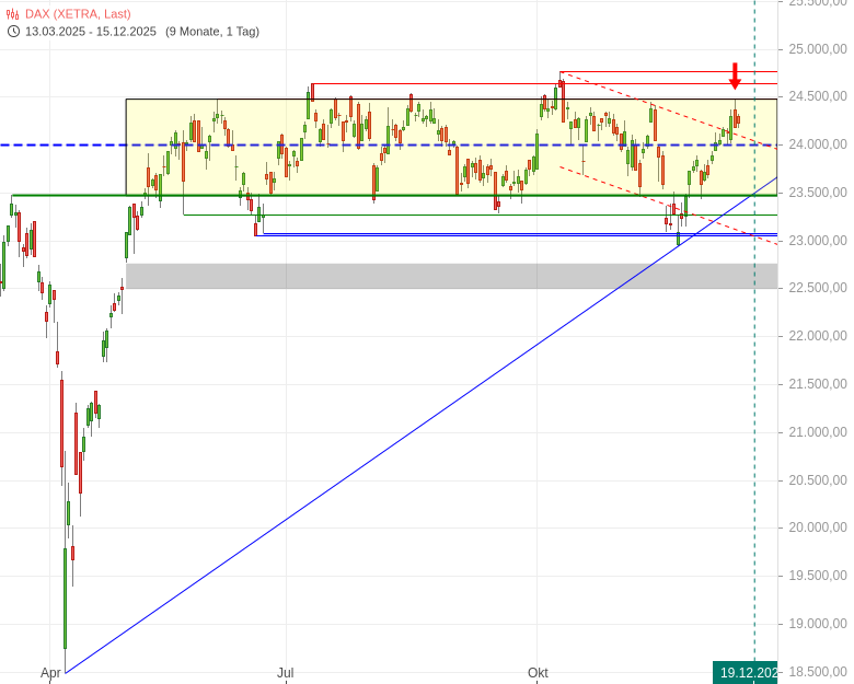 In der Analyse der Vorwoche entwarf ich das Szenario einer Analogie zum DAX-Verlauf zum November-Verfallstag. Damals setzte er eine laufende Abwärtsbewegung bis zum Verfallstag fort, während er in der Vorwoche in einer Aufwärtsbewegung war. Daher schrieb ich, "wenn dieser Anstieg weitergeht, könnte er die Oberkante des gelben Rechtecks bei 24.500 Punkten […] erreichen".