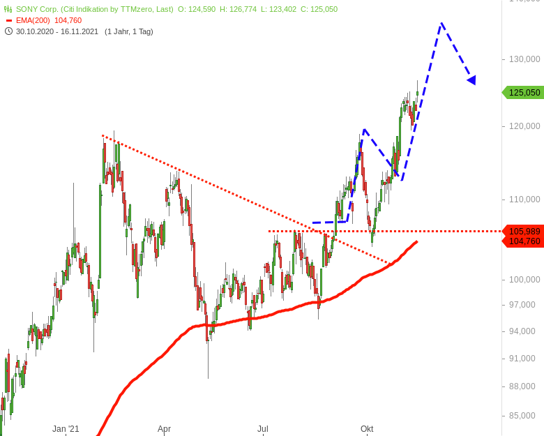 "Interessant wird es, wenn Sony über 107 USD auf Tagesschlusskursbasis ansteigen kann. Möglichst überzeugend über 107 USD! Ein Anstieg über 107 USD aktiviert ein mittelfristiges Kaufsignal mit Projektionszielen bei 119 und 135 USD. Mit dicken, blauen Pfeilen visualisiere ich Signale, die m.E. stark sind. Mit dicken, schwarzen moderate bis gute Signale. Mit dünnen, grauen visualisiere ich schwache Signale."