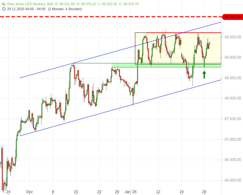 Immerhin erholten sich die Kurse zunächst. Und bislang bleiben die Aussichten formal bullisch: Es gibt zumindest einen leichten Aufwärtstrend im kurzfristigen Bereich (blau) und die wichtige grüne Unterstützungszone wurde zu Handelsbeginn erneut verteidigt. Daher sollte zumindest die Seitwärtsbewegung (gelbes Rechteck) weitergehen, was sich mit Beginn des offiziellen Handels auch bestätigte. Solange das so bleibt, lockt die Bullen auch weiterhin die runde 50.000-Punkte-Marke.