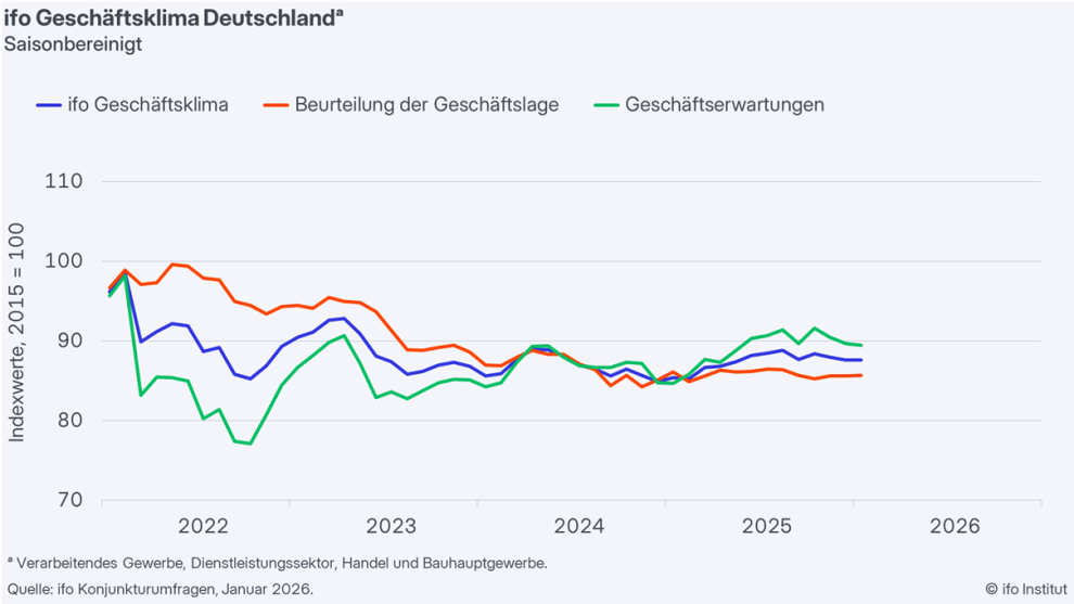 Der Geschäftsklimaindex für die deutsche Wirtschaft verharrte im Januar auf seinem Vormonatsniveau, bleibt also bei 87,6 Punkten, wie das Münchener ifo-Institut am Montag mitteilte.
