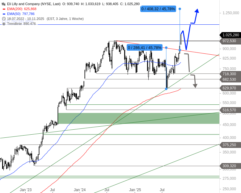 Die Aktie des Pharmakonzerns Eli Lilly kletterte in der letzten Woche erstmals in ihrer Historie über die Marke bei 1.000 USD und markierte ein Allzeithoch bei 1.033,62 USD. Wie könnte es nach diesem Rekordhoch jetzt weitergehen?