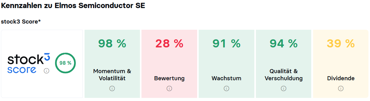 Elmos Semiconductor kommt im stock3 Score aktuell auf einen hervorragenden Wert von 98 %. Dabei kann die Aktie vor allem mit einem hohen Kursmomentum, einem hohen Umsatz- und Gewinnwachstum und einer guten Bilanzqualität punkten.