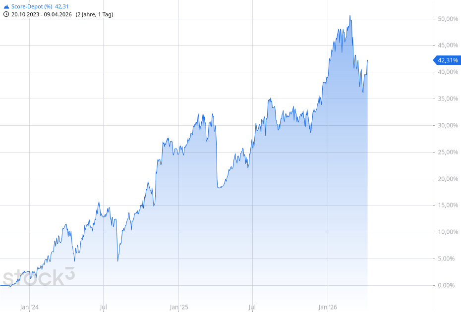 Im Score-Depot wird in fundamental aussichtsreiche Aktien investiert, die zudem über starkes Kursmomentum verfügen. Die Aktienselektion erfolgt auf Basis des stock3 Scores, der 30 fundamentale und quantitative Kriterien vollautomatisch auswertet, um gute Aktien zu finden. Bevorzugt werden Aktien mit hohem Gesamtscore und einem hohen Teilscore Momentum & Volatilität.
