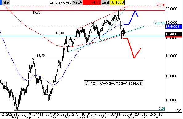 Diagnose: Mit dem Ausbruch über den Widerstand bei 13,75 $ konnte die Aktie von Emulex einen mittelfristigen Doppelboden ausbilden und stieg nach diesem Kaufsignal in den Vormonaten an. Im Hoch scheiterte die Aktie jetzt am Widerstand bei 19,70 $ und fiel zunächst unter die wichtige Kreuzunterstützung bei 16,30 $ zurück. Die an den Vortagen einsetzende Gegenbewegung wird jetzt wieder verkauft.