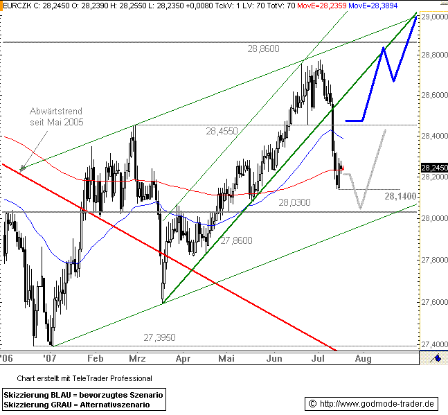 Rückblick: EUR/CZK startete zu Beginn des Jahres nach einem Tief bei 27,3950 CZK eine starke Rallye. Am 03.07.2007 erreichte das Währungspaar das aktuelle Rallyehoch bei 28,7750 CZK. Von dort aus brach Währungspaar deutlich ein, vor allem nach dem Bruch des steilen Aufwärtstrends ab 19.03.2007. Am Montag markierte EUR/CZK ein Tief bei 28,1400 CZK. Damit erreichte das Währungspaar exakt das rechnerische Ziel aus dem Bruch des steilen Aufwärtstrends, wo es dann auch sofort zu einer Gegenreaktion kam.