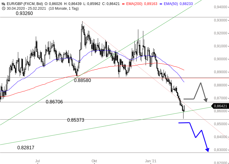 Beim Währungspaar EUR/GBP dominiert seit dem Scheitern an der Widerstandsmarke bei 0,93260 GBP ein weiterer Abwärtstrend, der zu Jahresbeginn unter die wichtige Unterstützung bei 0,88580 GBP führte. Nach diesem bärischen Signal beschleunigte sich der Ausverkauf und EUR/GBP setzte entlang einer früheren Abwärtstrendlinie bis an die Unterstützung bei 0,86706 GBP zurück. Diese wurde in den letzten Tagen ebenfalls unterschritten und der Support bei 0,85373 GBP erreicht. Hier startete gestern eine leichte Erholung.