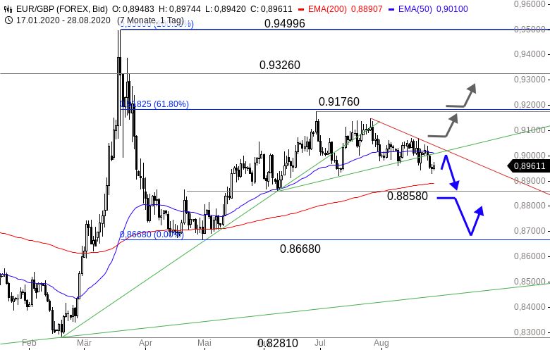 Aktuell beginnt sich dieser Abwärtsimpuls zu beschleunigen. Das Paar droht damit aus der Seitwärtsspanne der letzten Wochen zu fallen. Mit dem Scheitern am Bereich um 0,92000 GBP haben die Bullen im Juli die Chance auf eine Fortsetzung der Erholung bei EUR/GBP vergeben. Dies könnte sich jetzt in Form einer Abwärtsbewegung bis 0,88580 GBP rächen.