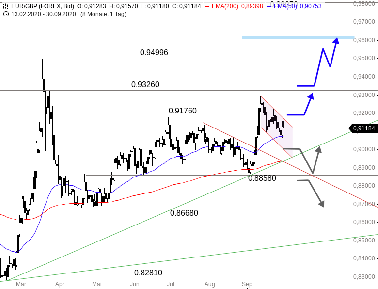 Seither arbeitet sich das Paar allerdings wieder in Richtung des massiven langfristigen Widerstands bei 0,93260 GBP nach oben und stieg zuletzt auch über die Hürde bei 0,91760 GBP an. Kurz vor dem entscheidenden Widerstand bei 0,93260 GBP setzte eine Gegenbewegung ein, die die Züge einer bullischen Flagge aufweist. Dieses Trendfortsetzungsmuster könnte in Kürze durchbrochen werden.