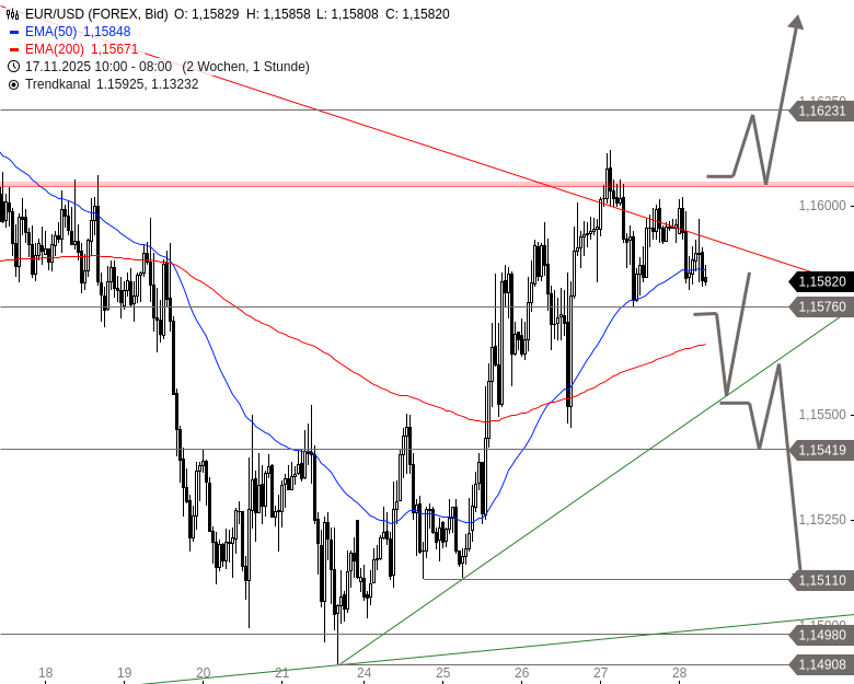 Unterstützungen: 1,1576 + 1,1551 + 1,1542 + 1,1511