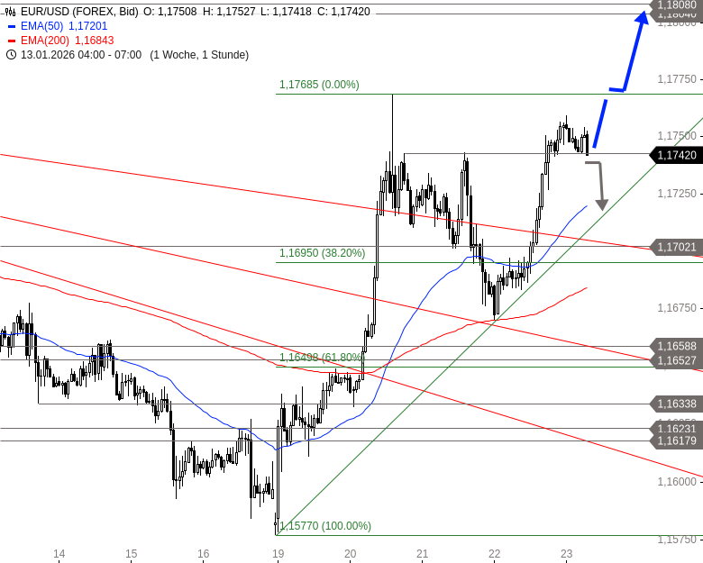 EUR/USD könnte heute das bisherige Wochenhoch bei 1,1769 USD angreifen. Bei einem Ausbruch ergäbe sich weiteres Potenzial bis in den Bereich zwischen 1,1804 und 1,1808 USD. Sollte EUR/USD aber unter 1,1743 USD abfallen, müsste mit Abgaben in Richtung 1,1720 bis 1,1709 USD gerechnet werden.