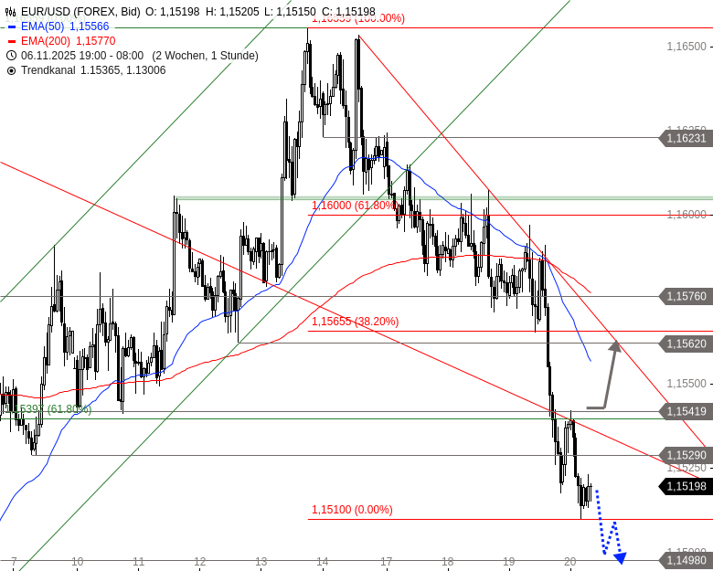 EUR/USD attackierte gestern am Morgen den kurzfristigen Abwärtstrend seit 14. November. Aber das Währungspaar scheiterte an diesem Trend. Auch ein zweiter Ausbruchsversuch am Mittag scheiterte. Danach kam es zu einem Abverkauf auf 1,1518 USD und damit zu einem Rückfall in den gebrochenen Abwärtstrend seit dem Jahreshoch. Am Abend erholte sich EUR/USD zwar wieder in Richtung dieses Trends, prallte aber daran nach unten ab und fiel in der Nacht auf ein neues Tief bei 1,1510 USD.