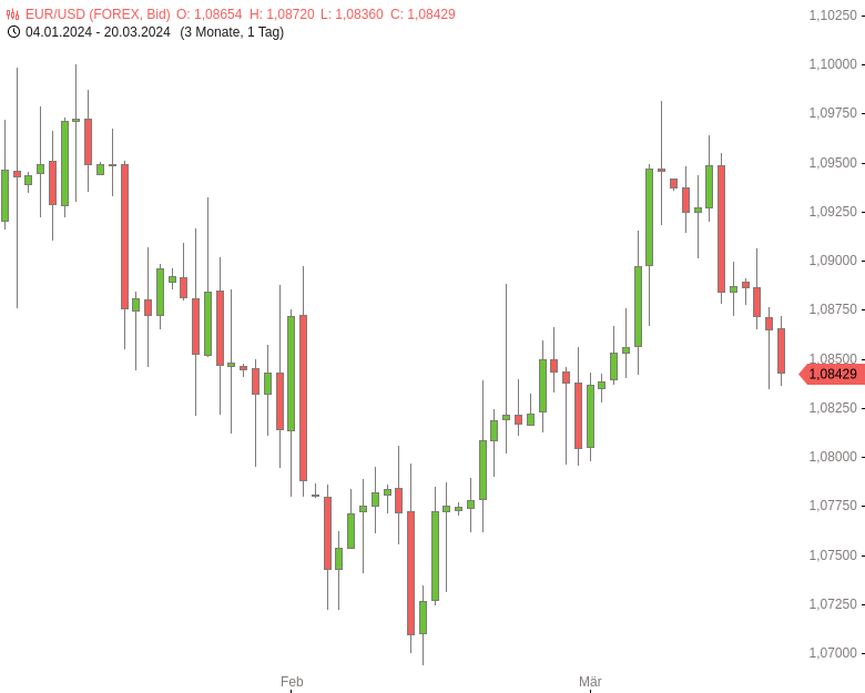 Gegen 13:20 Uhr MEZ notiert EUR/USD bei 1,0842. Unterhalb des o.g. Zweiwochentiefs vom 19. März 2024 bei 1,0835 findet sich die nächste markante Unterstützung am Tief vom 29. Februar 2024 bei 1,0796. Die nächsten Widerstände liegen an den Hochs vom 18. März 2024 bei 1,0906 und 13. März 2024 bei 1,0964. Darüber befindet sich das am 8. März 2024 bei 1,0981 markierte, knappe Zweimonatshoch.