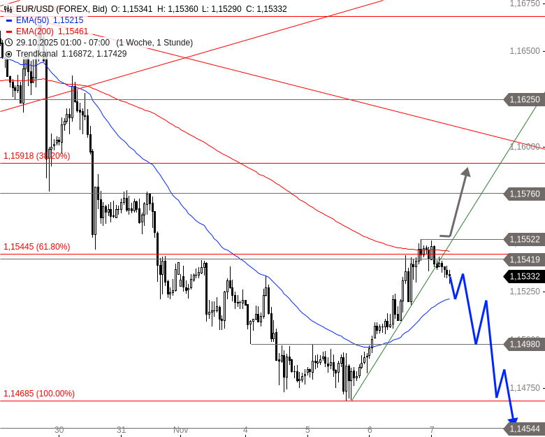 EUR/USD erholte sich gestern planmäßig und zog in der Spitze auf 1,1552 USD und damit etwas über ein kurzfristiges log. 38,2%-Retracement an. Dort stoppte gestern am Abend die Erholung. Heute Nacht scheiterte EUR/USD an diesem Hoch und fällt seitdem wieder zurück. Das Währungspaar befindet sich seit seinem Jahreshoch vom 17. September in einer mehrwöchigen Korrekturphase, die vermutlich ein Pullback an eine große Bodenformation darstellt.