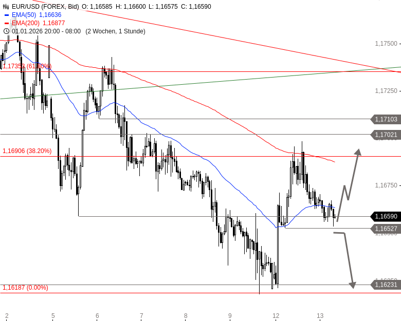 EUR/USD schoss gestern zunächst auf ein Hoch bei 1,1698 USD nach oben. Damit erreichte das Währungspaar das logarithmische 38,2%-Retracement der Abwärtsbewegung seit dem Hoch vom 24. Dezember. Zwar notierte EUR/USD kurzzeitig über diesem Retracement, das bei 1,1692 USD liegt, fiel aber schnell wieder darunter zurück. Inzwischen notiert EUR/USD in der Unterstützungszone zwischen 1,1659 und 1,1653 USD.