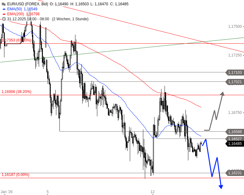 EUR/USD befindet sich seit 24. Dezember 2025 nach dem Scheitern am Widerstand bei 1,1804 USD in einer Abwärtsbewegung. Dabei fiel das Währungspaar auf 1,1619 USD zurück. Danach folgte vorgestern eine kurze, aber steile Erholung bis knapp über das log. 38,2%-Retracement der Abwärtsbewegung seit dem Hoch vom 24. Dezember. Dieser Erholungsschub wird seit vorgestern Mittag wieder abverkauft. EUR/USD fiel inzwischen wieder unter die Zone um 1,1659 bis 1,1653 USD, läuft aber unterhalb bisher seitwärts.