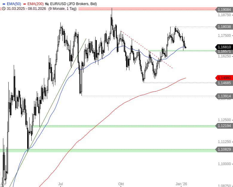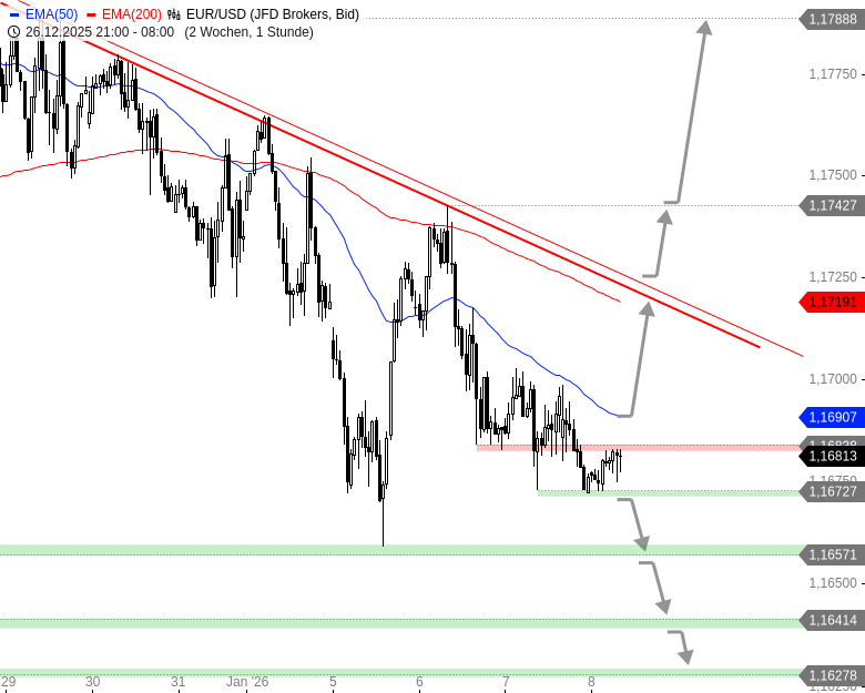 Fällt EUR/USD hingegen auch unter 1,1672 USD zurück, wären weitere Abgaben bis 1,1657 - 1,1659 und darunter 1,1641 oder 1,1628 USD denkbar.
