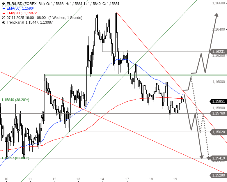 EUR/USD befindet sich seit 13. November 2025 nach einem Hoch bei 1,1656 USD in einer Konsolidierung. Dabei fiel das Währungspaar auf den Unterstützungsbereich um 1,1576 USD zurück. Seit gestern Abend läuft er an diesem Bereich seitwärts. Seit einigen Minuten versucht er sich sogar leicht zu lösen. Allerdings liegt im Bereich um 1,1591 bis 1,1594 USD schon ein erster Widerstandsbereich.