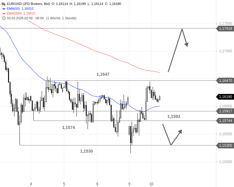 Charttechnischer Ausblick: Im Tageschart läuft folglich ein heißer Kampf um den EMA200 bei derzeit gut 1,1590 USD. Solange EUR/USD diesen halten kann, ist eine Fortsetzung der Erholung möglich. Im Stundenchart müsste das Währungspaar die Hürden bei 1,1647 und in Form des EMA200 Stunde bei 1,1662 USD aus dem Weg räumen, dann wäre dieser frei in Richtung 1,1742 USD. Unter 1,1574 USD wird dagegen ein Test der Unterstützung bei 1,1530 USD wahrscheinlicher.