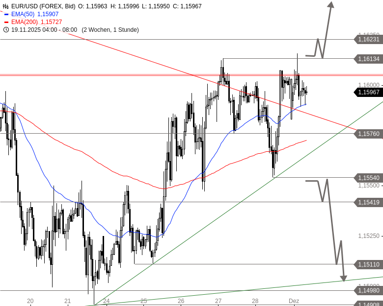 Unterstützungen: 1,1591 + 1,1576 + 1,1565 + 1,1554