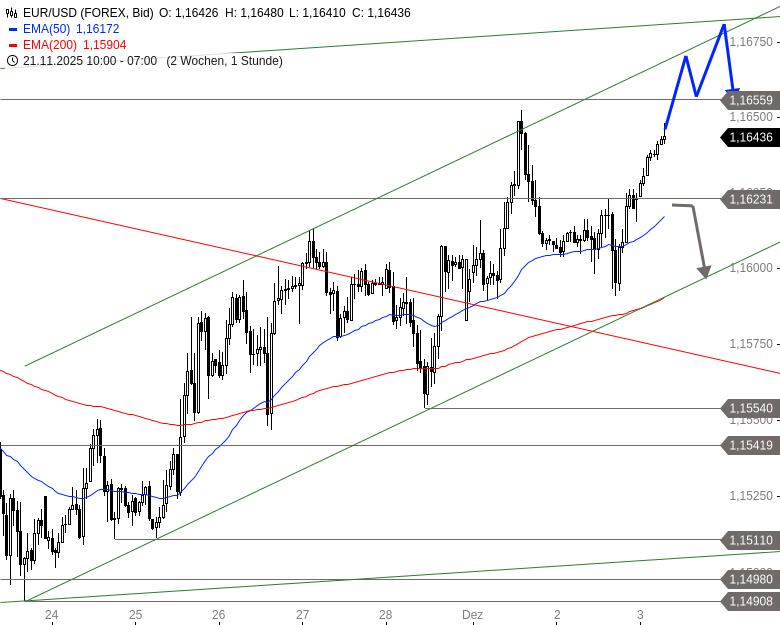 EUR/USD scheiterte gestern mit einem ersten Rallyversuch am Vormittag am Widerstand bei 1,1623 USD und setzte zunächst noch einmal in Richtung des Aufwärtstrends seit 21. November zurück. Am späten Nachmittag drehte das Währungspaar knapp oberhalb dieses Trends nach oben. Seitdem läuft eine Aufwärtsbewegung, in der sich EUR/USD inzwischen dem Hoch vom 13. November bei 1,1656 USD annähert.