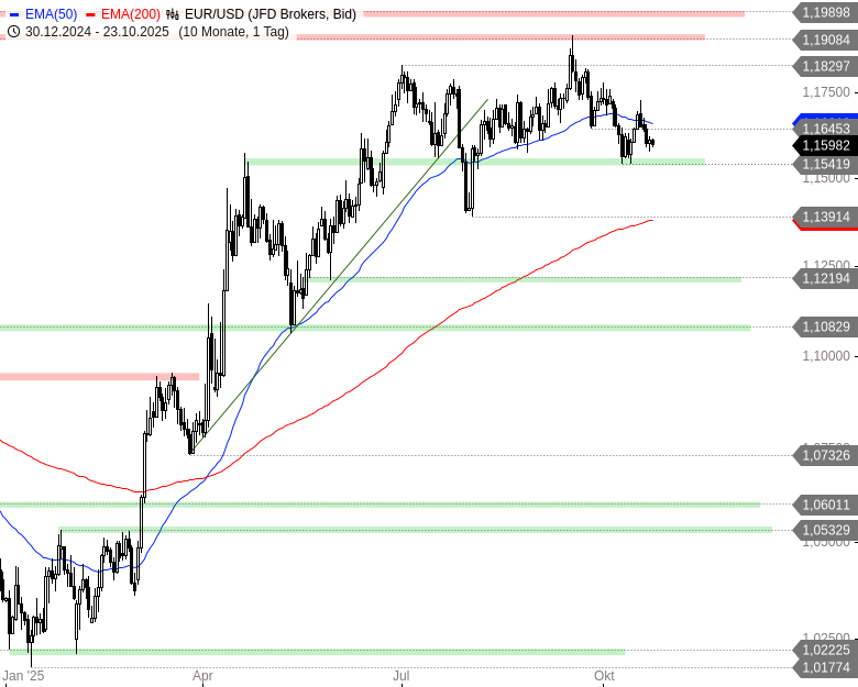 Der Bereich um 1,1590 USD bildet eine kleine Unterstützung, von wo aus eine weitere Erholung in Richtung des Stunden-EMA50 starten könnten. Darüber hinaus bleibt unklar, wohin die Reise geht. Bei 1,1622 - 1,1624 und 1,1645 - 1,1652 USD lägen oberhalb davon weitere Hürde. Erst wenn diese überwinden werden, steigen die Chancen auf größere Erholungen. Ansonsten wäre unterhalb von 1,1588 USD ein weiterer Test des gestrigen Tiefs bei 1,1577 USD denkbar. Darunter droht ein Abverkauf zu den Oktobertiefs bei 1,1542 USD. Spätestens dort sollte sich Gegenwehr der Käufer zeigen.